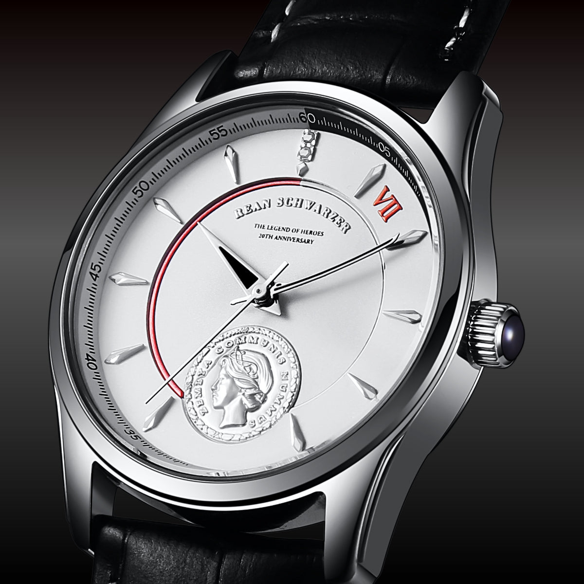 A watch that engraves the journey of Rean as he confronts a fateful destiny and grows alongside his classmates from Special Class VII. At the 6 o'clock position of the dial, a 50 Mira coin is crafted in three-dimensional metal, and 11 indices, representing the number of classmates in Class VII, are arranged to support Rean.