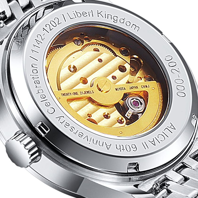 The anniversary model, which gathers the pinnacle of orbal technology, is equipped with a precise movement (MIYOTA "Cal.82S7") brought from the far East. Just like Her Majesty Queen Alicia II, who steadfastly maintained her reign amid the turmoil of the royal capital's chaos, its heartbeat surely continues to mark the passage of time.