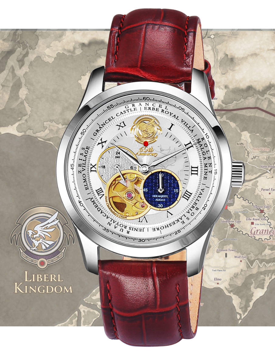 The center of the dial features a layout of the Liberl Kingdom map. Around it are engraved the names of the places Joshua and Estelle visited—Grancel, Rolent, Bose, Ruan, and Zeiss. At the 6 o'clock position, a guilloché pattern reminiscent of the queen's dress embroidery appears, along with the inscription "HER MAJESTY, ALICIA." The case back is skeleton-style, revealing the mechanical heartbeat inside, and this special piece is marked with an edition number limited to 200 units.
