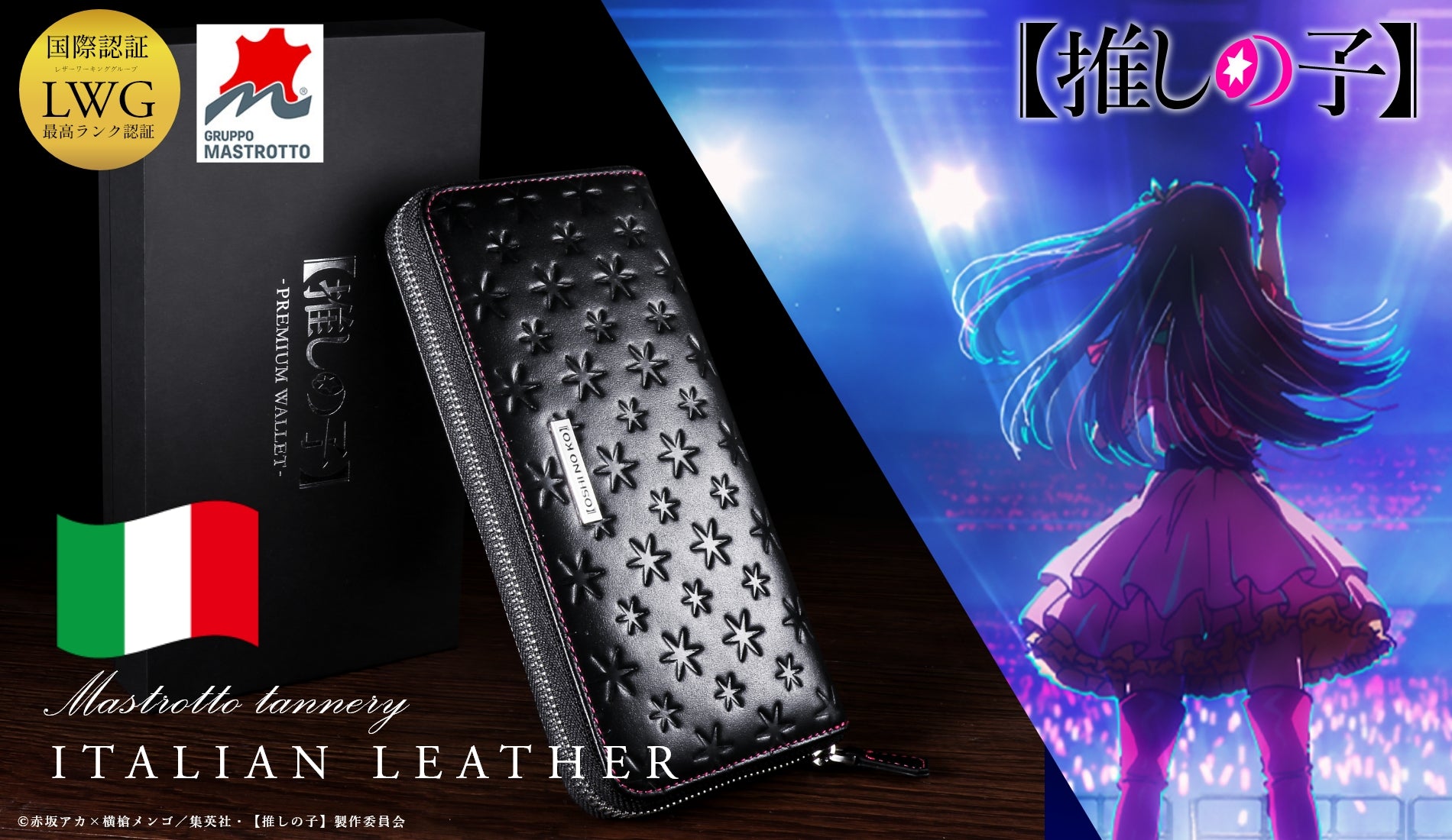 Anime "Oshi no Ko" collaborated long wallet. The leather from Mastrotto is used by global apparel brands, Italian-made furniture, and luxury cars, and is rarely used for anime merchandise, making this item a rare gem. The product logo is engraved with high-quality silver foil and delivered in a special box. Sales will end once the genuine leather stock is depleted.