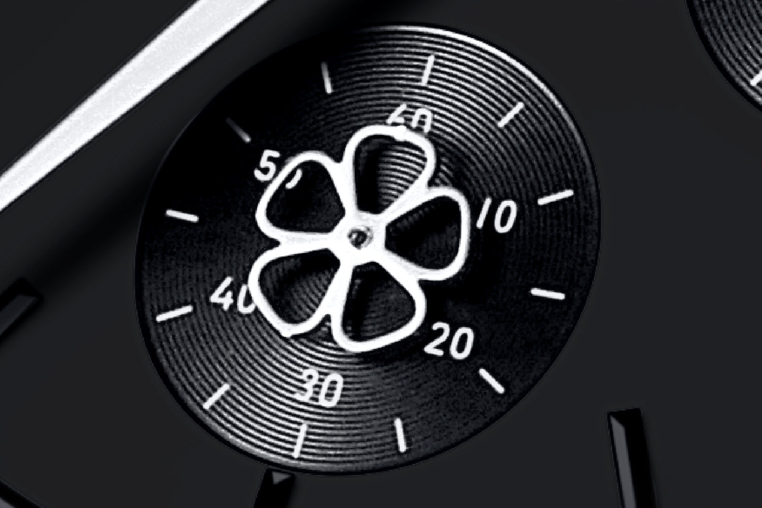The warm dark gray dial is inspired by the maid outfit of a lamb. The chronograph hands, modeled after a beloved ribbon, rotate to indicate the time.