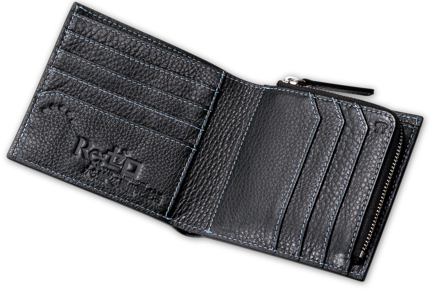 A bifold wallet made of high-quality shrunk embossed genuine leather from Mastrott, a brand chosen by the world's top maisons, featuring a metal decoration engraved with the name "Rem."