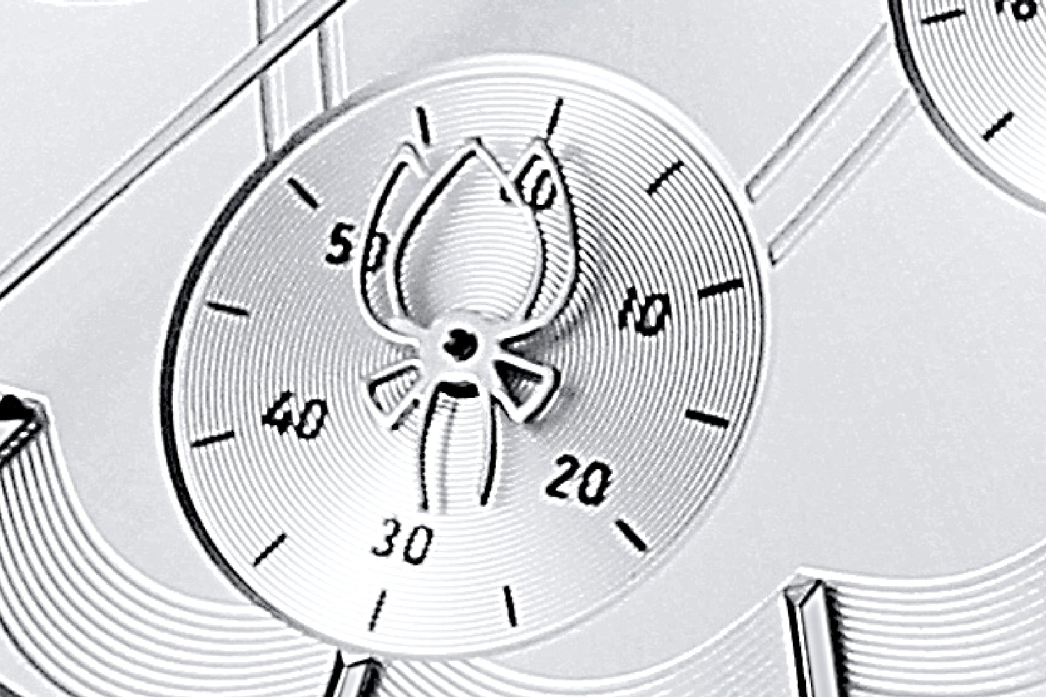 The warm white silver dial is inspired by a white robe. The chronograph hands, modeled after a beloved ribbon adorned with white flowers, rotate to indicate the time.