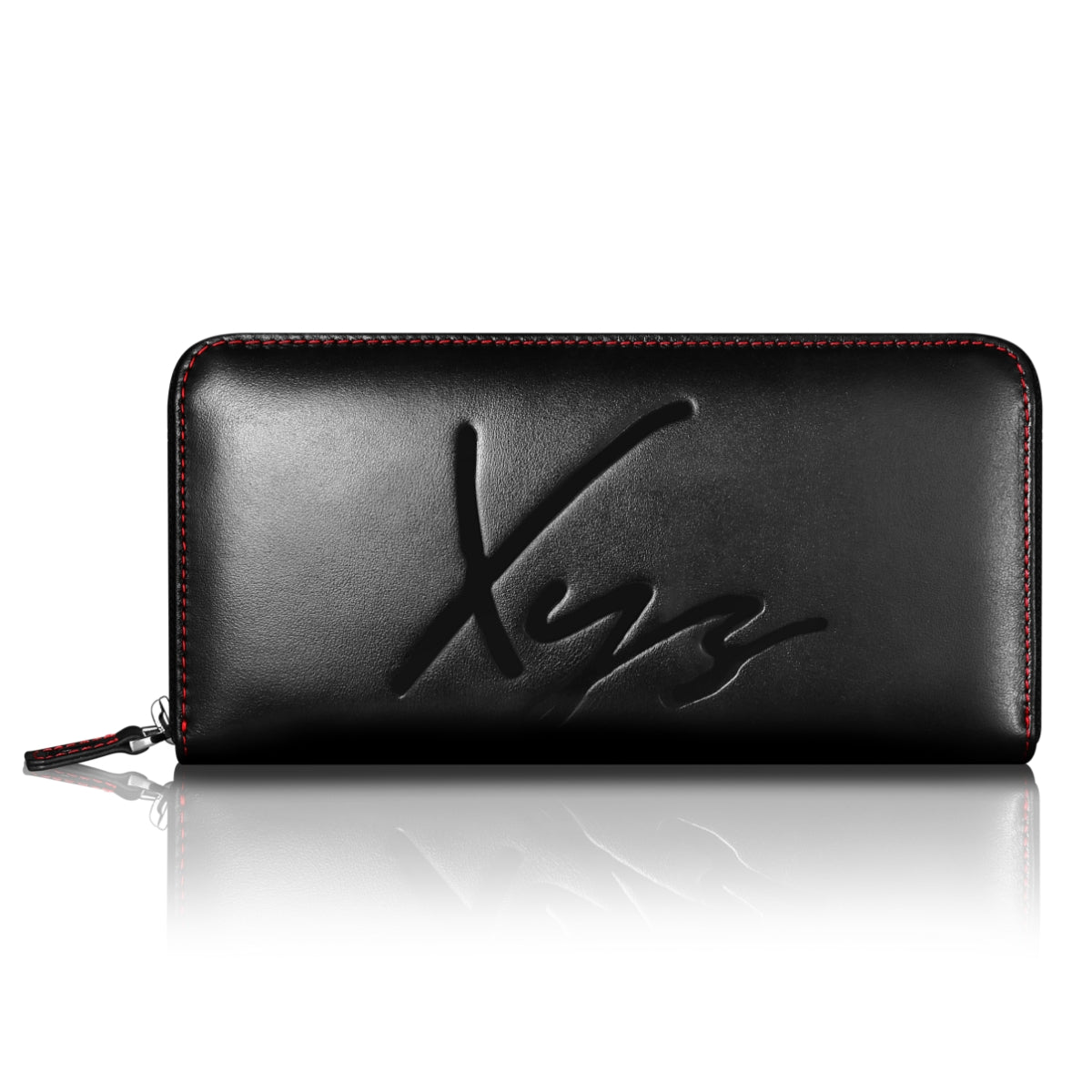 表側にはシティーハンターを呼ぶ合言葉 「xyz」を刻印。主張しすぎない素押しで上品な仕上がり。裏側には公式ロゴを刻印ブラックのイタリアンレザーにレッドの差し色が映える。