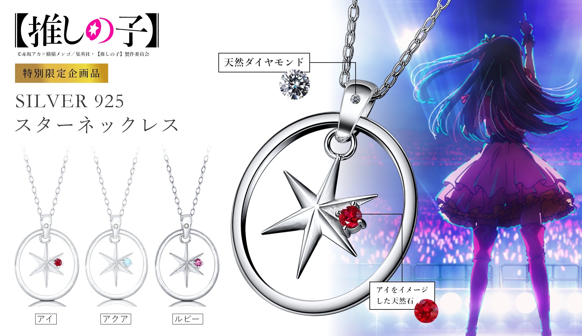 キャラクターの瞳に輝く星をモチーフにしたシルバーネックレス(Silver925)。アイ、アクア、ルビー 3人のネックレスにはそれぞれキャラクターをモチーフにした大粒の天然石と天然ダイヤモンドがあしらわれています。